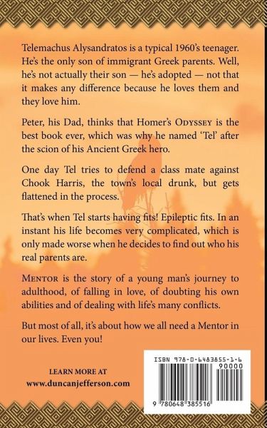 Mentors - we all need one. In fact, over the course of a lifetime we should probably have several of them. And when our time comes, we should all dare to be Mentors too. Telemachus Alesandratos is a typical teenager in rural Australia back in the late '60s. He's the only son of immigrant Greek parents who run the local fruit and veggie shop in the small town of Yarramah. In fact he's not their son - he's adopted, or "chosen" as his parents choose to say - not that it makes any difference because he loves them and they love Tel. Being Greek, Tel's Dad Peter loves Homer's Odyssey, and Tel grew up learning all about the trials and tribulations of Odysseus, the hero of Homer's story. In fact his Dad named his son after the son of his Ancient Greek hero. One day Tel finds himself defending one of his class mates, a girl called Julie, against the town's local drunk, Chook Harris, but things don't go too well and Tel gets flattened in the process. That's when Tel starts having fits! Epileptic fits. Then his life becomes very complicated. During one fit he finds himself in Ithaca in Ancient Greece talking with his namesake, the son of the long missing Odysseus. There he meets Mentor himself, but he is never quite sure whether it really is Mentor or the goddess Athene whom he's talking to. When it comes to helping those she likes - and she likes anyone who likes Odysseus - Athene can take on any form, whether it be Mentor, an owl or even the scent of Rosemary. "Mentor" tells the story of how young people need a Mentor in their lives. For Tel, his mentor comes in the form of Kevin O'Ryan - who has an uncanny resemblance to Mentor in Ithaca. Kev is a hard working, hard playing larrikin who captains the local footy team - but never trains - and who's mates call him Rooster (but never to his face) for the effect he has on the ladies. But behind Kev's facade is a wise, good man with a big and generous heart. As the story unfolds, Tel decides he wants to find out who his real parents are and also if he really does have epilepsy, or is it all just a dream. This is the story of a young man's journey to adulthood, of falling in love, of doubting his own abilities and of dealing with life's many conflicts. But life does present us with mentors along that path if only we have the eyes to see them. Tel's search for his real parents has unexpected consequences as he learns that the world is bigger and more extraordinary than he could ever have imagined.