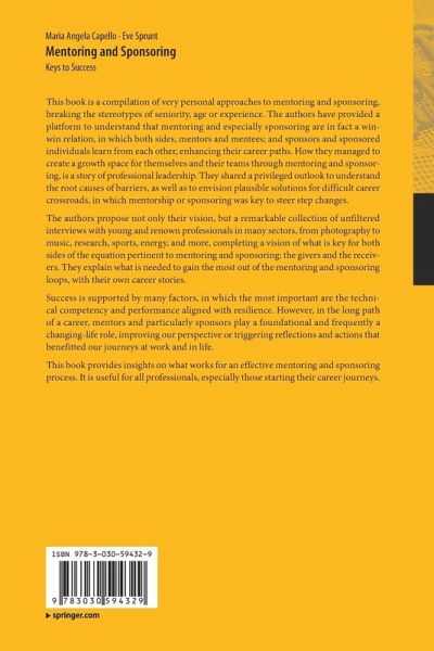 The authors propose not only their vision, but a remarkable collection of unfiltered interviews with young and renown professionals in many sectors, from photography to music, research, sports, energy, and more, completing a vision of what is key for both sides of the equation pertinent to mentoring and sponsoring: the givers and the receivers. They explain what is needed to gain the most out of the mentoring and sponsoring loops, with their own career stories.