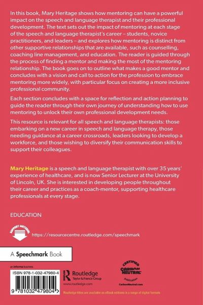 In this book, Mary Heritage shows how mentoring can have a powerful impact on the speech and language therapist and their professional development. The text sets out the impact of mentoring at each stage of the speech and language therapist's career - students, novice practitioners, and leaders - and explores how mentoring is distinct from other supportive relationships that are available, such as counselling, coaching line management, and education. The reader is guided through the process of finding a mentor and making the most of the mentoring relationship. The book goes on to outline what makes a good mentor and concludes with a vision and call to action for the profession to embrace mentoring more widely, with particular focus on creating a more inclusive professional community.