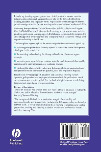 This new edition covers the essential information required to provide learning and support for newly qualified staff. It provides an excellent introduction that is current, relevant and comprehensive in its coverage. Additions to this new edition include coverage of clinical supervision and its relationship to mentoring and preceptorship. This text describes in detail the three main support roles: clinical supervision, mentoring, and preceptorship. These roles are illustrated throughout by case studies.
