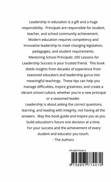 Educational leadership is a gift and a huge responsibility. Principals are responsible for student, teacher, and school community achievement. Modern education requires competency and innovative leadership to meet changing legislation, pedagogies, and student requirements. Mentoring School Principals: 200 Lessons for Leadership Success is your trusted friend. This book distils insights from decades of experience from seasoned educators and leadership gurus into meaningful teachings. These tips can help you manage difficulties, inspire greatness, and create a vibrant school culture, whether you are a new principal or a seasoned leader. Leadership is about asking the correct questions, learning, and leading with integrity, not having all the answers. May this book guide and inspire you as you build education's future one decision at a time. For your success and the achievement of every student and educator you touch. The Authors