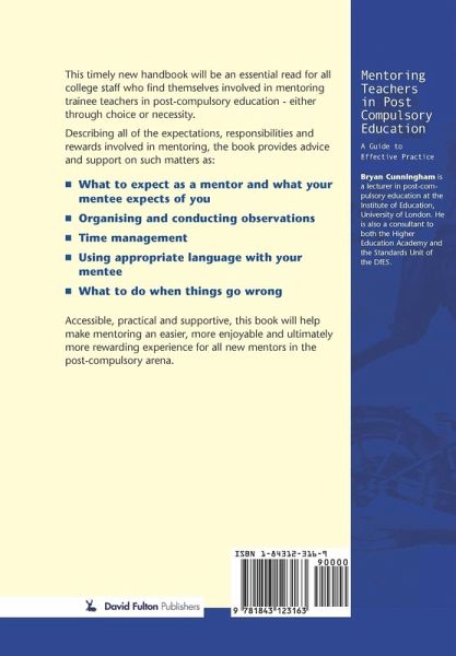 This timely new handbook will be an essential read for all college staff who find themselves involved in mentoring trainee teachers in post-compulsory education, either through choice or necessity! Describing all of the expectations, responsibilities and rewards involved in mentoring college teachers in training; the book provides advice and support on: * What to expect as a mentor and what your mentee expects of you! * Organizing and conducting observations * Time management * Using appropriate language with your mentee * What to do when things go wrong! Accessible, practical and supportive, this book will help make mentoring an easier, more enjoyable and ultimately rewarding experience for all new mentors in the post-compulsory workplace. It will also be of great value to both teachers trainers and key staff in colleges, such as staff development managers, who play an important role in overseeing the delivery and quality of mentoring activities.