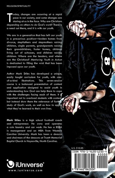 Today, changes are occurring at a rapid pace in our society, and some changes are staring at us in the face. Why are Christians depending on others to do God's work? There is a need out there, and it is with our youth. We are in a generation that has left our youth in a precarious position-broken homes from divorce, stepfathers and stepmothers raising children, single parents, grandparents raising their grandchildren, foster homes, children living out of suitcases, and children raising children. Where are the leaders, and where are the Christians? Mentoring Youth in Action is dedicated to filling the void that has been imposed upon our youth. Author Mark Stiles has developed a unique, easily taught curriculum for youth, with one-of-a-kind illustrations. This seven-session course is a balanced presentation of content and application designed to assist youth in understanding how God can help them to cope with the challenges facing each of them. It is important not to overload students with content, but instead show them the relevance of further study of God's work, as well as how to apply what they've learned to their own lives.