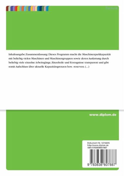 Dieses Programm macht die Maschinenparkkapazität mit beliebig vielen Maschinen und Maschinengruppen sowie deren Auslastung durch beliebig viele einzelne Arbeitsgänge, Einzelteile und Erzeugnisse transparent und gibt somit Aufschluss über aktuelle Kapazitätsgrenzen bzw. -reserven. Durch Situationssimulation der zukünftigen Fertigungspalette können heute schon Maßnahmen ergriffen werden, die drohende Kapazitätsüberhänge oder -engpässe in der Zukunft ausgleichen.