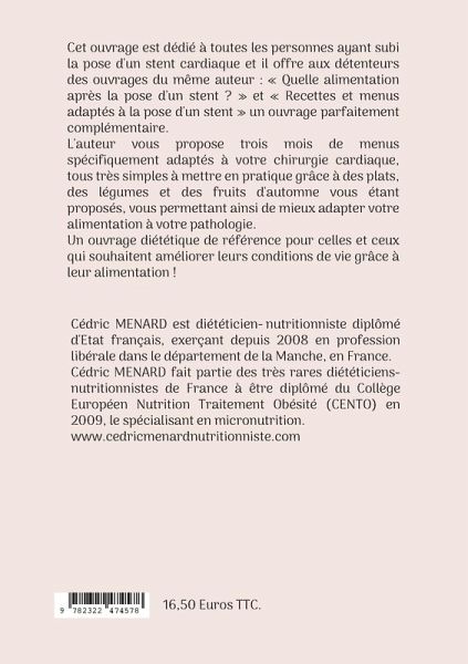 Cet ouvrage est dédié à toutes les personnes ayant subi la pose d'un stent cardiaque et il offre aux détenteurs des ouvrages du même auteur : « Quelle alimentation après la pose d'un stent ? » et « Recettes et menus adaptés à la pose d'un stent » un ouvrage parfaitement complémentaire.L'auteur vous propose trois mois de menus spécifiquement adaptés à votre chirurgie cardiaque, tous très simples à mettre en pratique grâce à des plats, des légumes et des fruits d'automne vous étant proposés, vous permettant ainsi de mieux adapter votre alimentation à votre pathologie.Un ouvrage diététique de référence pour celles et ceux qui souhaitent améliorer leurs conditions de vie grâce à leur alimentation !