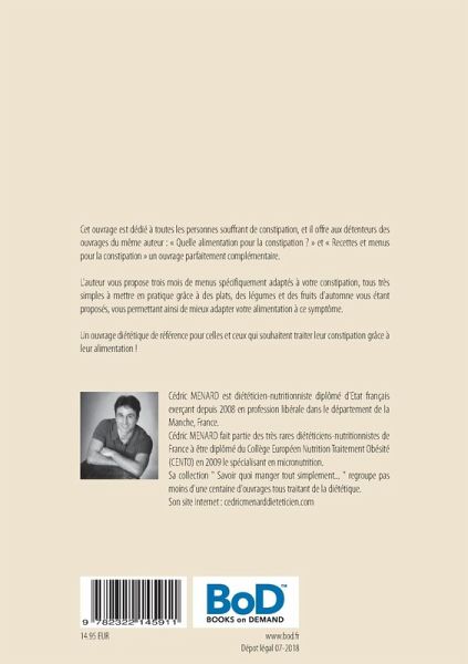 L'auteur vous propose trois mois de menus spécifiquement adaptés à votre constipation, tous très simples à mettre en pratique grâce à des plats, des légumes et des fruits d'automne vous étant proposés, vous permettant ainsi de mieux adapter votre alimentation à ce symptôme.