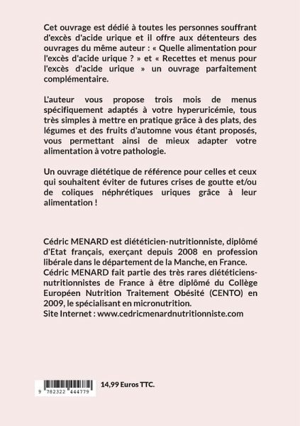 Cet ouvrage est dédié à toutes les personnes souffrant d'excès d'acide urique et il offre aux détenteurs des ouvrages du même auteur : « Quelle alimentation pour l'excès d'acide urique ? » et « Recettes et menus pour l'excès d'acide urique » un ouvrage parfaitement complémentaire.L'auteur vous propose trois mois de menus spécifiquement adaptés à votre hyperuricémie, tous très simples à mettre en pratique grâce à des plats, des légumes et des fruits d'automne vous étant proposés, vous permettant ainsi de mieux adapter votre alimentation à votre pathologie.Un ouvrage diététique de référence pour celles et ceux qui souhaitent éviter de futures crises de goutte et/ou de coliques néphrétiques uriques grâce à leur alimentation !