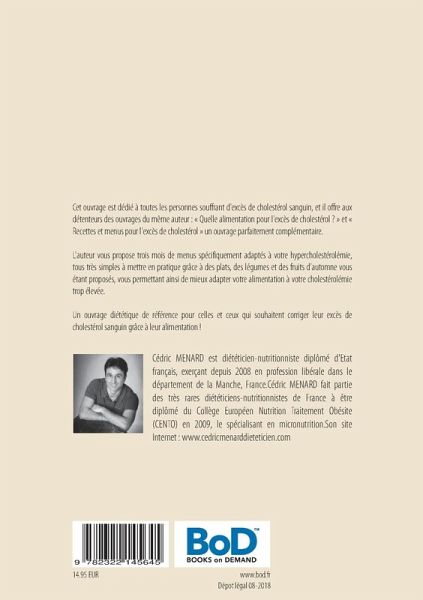 L'auteur vous propose trois mois de menus spécifiquement adaptés à votre hypercholestérolémie, tous très simples à mettre en pratique grâce à des plats, des légumes et des fruits d'automne vous étant proposés, vous permettant ainsi de mieux adapter votre alimentation à votre cholestérolémie trop élevée.