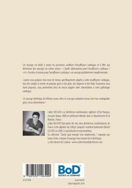 L'auteur vous propose trois mois de menus spécifiquement adaptés à votre insuffisance cardiaque, tous très simples à mettre en pratique grâce à des plats, des légumes et des fruits d'automne vous étant proposés, vous permettant ainsi de mieux adapter votre alimentation à votre pathologie cardiaque.