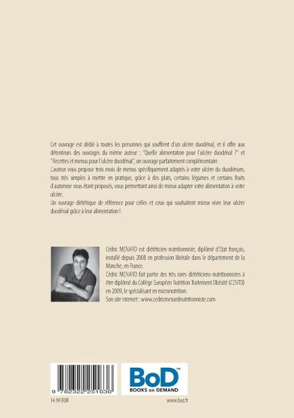 Cet ouvrage est dédié à toutes les personnes qui souffrent d'un ulcère duodénal, et il offre aux détenteurs des ouvrages du même auteur : " Quelle alimentation pour l'ulcère duodénal ? " et " Recettes et menus pour l'ulcère duodénal" un ouvrage parfaitement complémentaire.L'auteur vous propose trois mois de menus spécifiquement adaptés à votre ulcère du duodénum, tous très simples à mettre en pratique grâce à des plats, certains légumes et certains fruits d'automne vous étant proposés, vous permettant ainsi de mieux adapter votre alimentation à votre ulcère.Un ouvrage diététique de référence pour celles et ceux qui souhaitent mieux vivre leur ulcère duodénal grâce à leur alimentation !