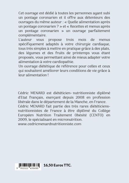 Cet ouvrage est dédié à toutes les personnes ayant subi un pontage coronarien et il offre aux détenteurs des ouvrages du même auteur : « Quelle alimentation après un pontage coronarien ? » et « Recettes et menus après un pontage coronarien » un ouvrage parfaitement complémentaire.L'auteur vous propose trois mois de menus spécifiquement adaptés à votre chirurgie cardiaque, tous très simples à mettre en pratique grâce à des plats, des légumes et des fruits de printemps vous étant proposés, vous permettant ainsi de mieux adapter votre alimentation à votre cardiopathie.Un ouvrage diététique de référence pour celles et ceux qui souhaitent améliorer leurs conditions de vie grâce à leur alimentation !