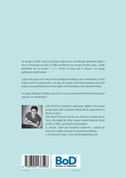 L'auteur vous propose trois mois de menus spécifiquement adaptés à votre corticothérapie, tous très simples à mettre en pratique grâce à des plats, des légumes et des fruits de printemps vous étant proposés, vous permettant ainsi de mieux adapter votre alimentation à votre traitement médical.