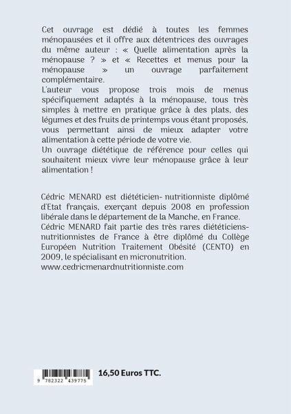Cet ouvrage est dédié à toutes les femmes ménopausées et il offre aux détentrices des ouvrages du même auteur : « Quelle alimentation après la ménopause ? » et « Recettes et menus pour la ménopause » un ouvrage parfaitement complémentaire.L'auteur vous propose trois mois de menus spécifiquement adaptés à la ménopause, tous très simples à mettre en pratique grâce à des plats, des légumes et des fruits de printemps vous étant proposés, vous permettant ainsi de mieux adapter votre alimentation à cette période de votre vie.Un ouvrage diététique de référence pour celles qui souhaitent mieux vivre leur ménopause grâce à leur alimentation !