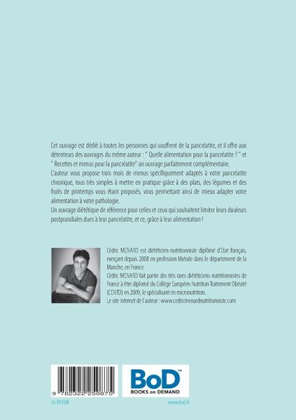 Cet ouvrage est dédié à toutes les personnes qui souffrent de la pancréatite, et il offre aux détenteurs des ouvrages du même auteur : " Quelle alimentation pour la pancréatite ? " et " Recettes et menus pour la pancréatite" un ouvrage parfaitement complémentaire.L'auteur vous propose trois mois de menus spécifiquement adaptés à votre pancréatite chronique, tous très simples à mettre en pratique grâce à des plats, des légumes et des fruits de printemps vous étant proposés, vous permettant ainsi de mieux adapter votre alimentation à votre pathologie.Un ouvrage diététique de référence pour celles et ceux qui souhaitent limiter leurs douleurs postprandiales dues à leur pancréatite, et ce, grâce à leur alimentation !