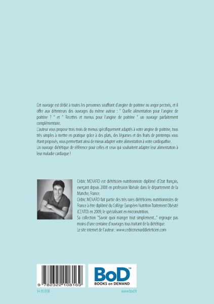 L'auteur vous propose trois mois de menus spécifiquement adaptés à votre angine de poitrine, tous très simples à mettre en pratique grâce à des plats, des légumes et des fruits de printemps vous étant proposés, vous permettant ainsi de mieux adapter votre alimentation à votre cardiopathie.
