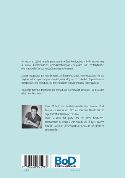 Cet ouvrage est dédié à toutes les personnes qui souffrent du mégacôlon, et il offre aux détenteurs des ouvrages du même auteur : " Quelle alimentation pour le mégacôlon ? " et " Recettes et menus pour le mégacôlon" un ouvrage parfaitement complémentaire.L'auteur vous propose trois mois de menus spécifiquement adaptés à votre mégacôlon, tous très simples à mettre en pratique grâce à des plats, certains légumes et certains fruits de printemps vous étant proposés, vous permettant ainsi de mieux adapter votre alimentation à votre mégacôlon.Un ouvrage diététique de référence pour celles et ceux qui souhaitent mieux vivre leur mégacôlon grâce à leur alimentation !