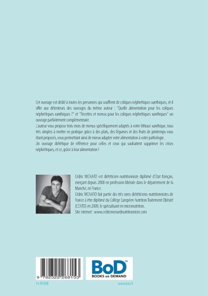 Cet ouvrage est dédié à toutes les personnes qui souffrent de coliques néphrétiques xanthiques, et il offre aux détenteurs des ouvrages du même auteur : "Quelle alimentation pour les coliques néphrétiques xanthiques ?" et "Recettes et menus pour les coliques néphrétiques xanthiques" un ouvrage parfaitement complémentaire.L'auteur vous propose trois mois de menus spécifiquement adaptés à votre lithiase xanthique, tous très simples à mettre en pratique grâce à des plats, des légumes et des fruits de printemps vous étant proposés, vous permettant ainsi de mieux adapter votre alimentation à votre pathologie.Un ouvrage diététique de référence pour celles et ceux qui souhaitent supprimer les crises néphrétiques, et ce, grâce à leur alimentation !