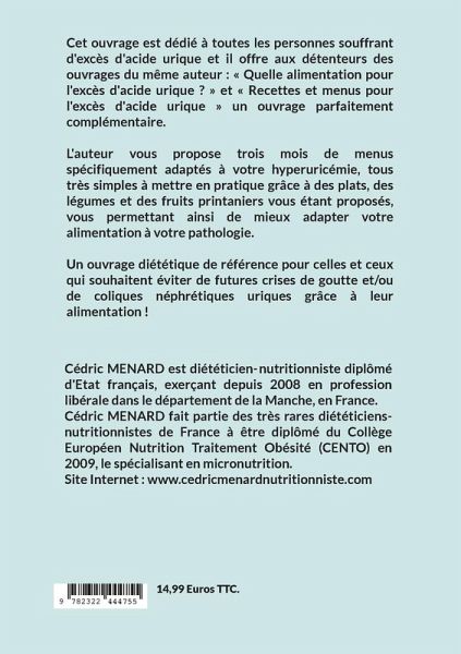 Cet ouvrage est dédié à toutes les personnes souffrant d'excès d'acide urique et il offre aux détenteurs des ouvrages du même auteur : « Quelle alimentation pour l'excès d'acide urique ? » et « Recettes et menus pour l'excès d'acide urique » un ouvrage parfaitement complémentaire.L'auteur vous propose trois mois de menus spécifiquement adaptés à votre hyperuricémie, tous très simples à mettre en pratique grâce à des plats, des légumes et des fruits printaniers vous étant proposés, vous permettant ainsi de mieux adapter votre alimentation à votre pathologie.Un ouvrage diététique de référence pour celles et ceux qui souhaitent éviter de futures crises de goutte et/ou de coliques néphrétiques uriques grâce à leur alimentation !
