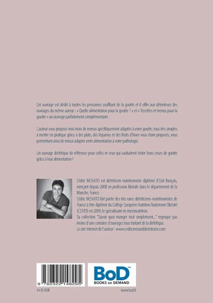 L'auteur vous propose trois mois de menus spécifiquement adaptés à votre goutte, tous très simples à mettre en pratique grâce à des plats, des légumes et des fruits d'hiver vous étant proposés, vous permettant ainsi de mieux adapter votre alimentation à votre pathologie.