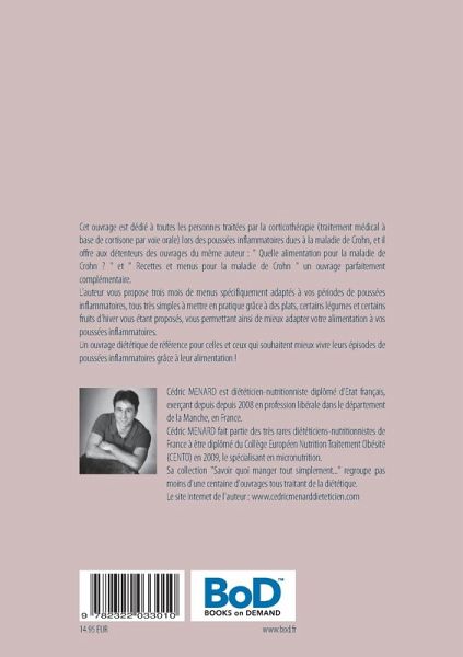 Cet ouvrage est dédié à toutes les personnes traitées par la corticothérapie (traitement médical à base de cortisone par voie orale) lors des poussées inflammatoires dues à la maladie de Crohn, et il offre aux détenteurs des ouvrages du même auteur : " Quelle alimentation pour la maladie de Crohn ? " et " Recettes et menus pour la maladie de Crohn " un ouvrage parfaitement complémentaire.