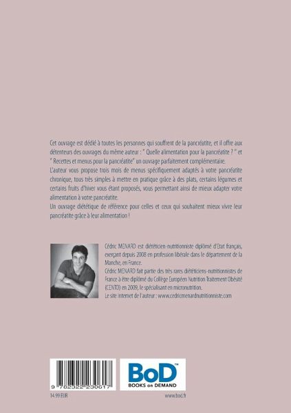 Cet ouvrage est dédié à toutes les personnes qui souffrent de la pancréatite, et il offre aux détenteurs des ouvrages du même auteur : " Quelle alimentation pour la pancréatite ? " et " Recettes et menus pour la pancréatite" un ouvrage parfaitement complémentaire.L'auteur vous propose trois mois de menus spécifiquement adaptés à votre pancréatite chronique, tous très simples à mettre en pratique grâce à des plats, certains légumes et certains fruits d'hiver vous étant proposés, vous permettant ainsi de mieux adapter votre alimentation à votre pancréatite.Un ouvrage diététique de référence pour celles et ceux qui souhaitent mieux vivre leur pancréatite grâce à leur alimentation !