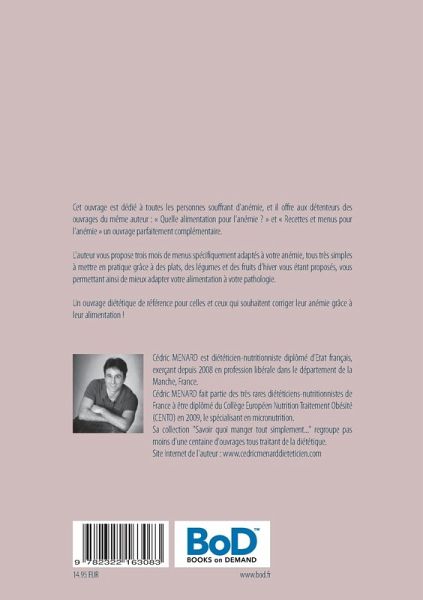 L'auteur vous propose trois mois de menus spécifiquement adaptés à votre anémie, tous très simples à mettre en pratique grâce à des plats, des légumes et des fruits d'hiver vous étant proposés, vous permettant ainsi de mieux adapter votre alimentation à votre pathologie.