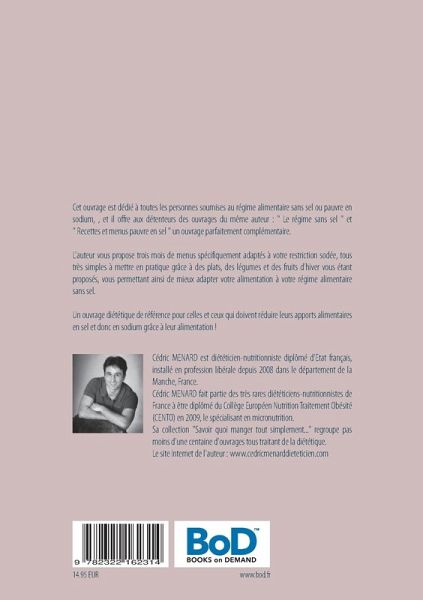 L'auteur vous propose trois mois de menus spécifiquement adaptés à votre restriction sodée, tous très simples à mettre en pratique grâce à des plats, des légumes et des fruits d'hiver vous étant proposés, vous permettant ainsi de mieux adapter votre alimentation à votre régime alimentaire sans sel.