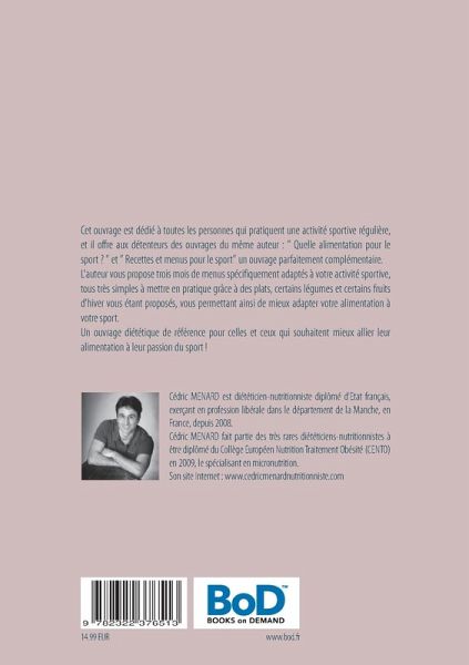 Cet ouvrage est dédié à toutes les personnes qui pratiquent une activité sportive régulière, et il offre aux détenteurs des ouvrages du même auteur : " Quelle alimentation pour le sport ? " et " Recettes et menus pour le sport" un ouvrage parfaitement complémentaire.L'auteur vous propose trois mois de menus spécifiquement adaptés à votre activité sportive, tous très simples à mettre en pratique grâce à des plats, certains légumes et certains fruits d'hiver vous étant proposés, vous permettant ainsi de mieux adapter votre alimentation à votre sport.Un ouvrage diététique de référence pour celles et ceux qui souhaitent mieux allier leur alimentation à leur passion du sport !