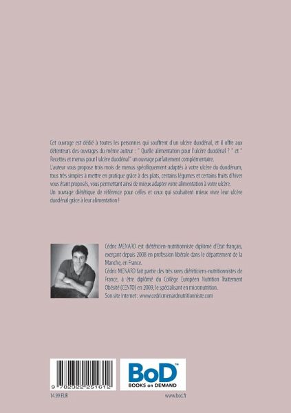 Cet ouvrage est dédié à toutes les personnes qui souffrent d'un ulcère duodénal, et il offre aux détenteurs des ouvrages du même auteur : " Quelle alimentation pour l'ulcère duodénal ? " et " Recettes et menus pour l'ulcère duodénal" un ouvrage parfaitement complémentaire.L'auteur vous propose trois mois de menus spécifiquement adaptés à votre ulcère du duodénum, tous très simples à mettre en pratique grâce à des plats, certains légumes et certains fruits d'hiver vous étant proposés, vous permettant ainsi de mieux adapter votre alimentation à votre ulcère.Un ouvrage diététique de référence pour celles et ceux qui souhaitent mieux vivre leur ulcère duodénal grâce à leur alimentation !