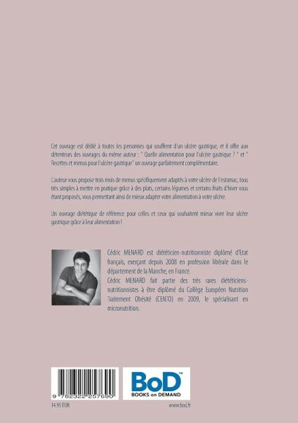 Cet ouvrage est dédié à toutes les personnes qui souffrent d'un ulcère gastrique, et il offre aux détenteurs des ouvrages du même auteur : " Quelle alimentation pour l'ulcère gastrique ? " et " Recettes et menus pour l'ulcère gastrique" un ouvrage parfaitement complémentaire.L'auteur vous propose trois mois de menus spécifiquement adaptés à votre ulcère de l'estomac, tous très simples à mettre en pratique grâce à des plats, certains légumes et certains fruits d'hiver vous étant proposés, vous permettant ainsi de mieux adapter votre alimentation à votre ulcère.Un ouvrage diététique de référence pour celles et ceux qui souhaitent mieux vivre leur ulcère gastrique grâce à leur alimentation !