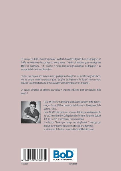 Cet ouvrage est dédié à toutes les personnes souffrant d'inconforts digestifs divers ou dyspepsies, et il offre aux détenteurs des ouvrages du même auteur : " Quelle alimentation pour une digestion difficile ou dyspepsies ? " et " Recettes et menus pour une digestion difficile ou dyspepsies " un ouvrage parfaitement complémentaire.