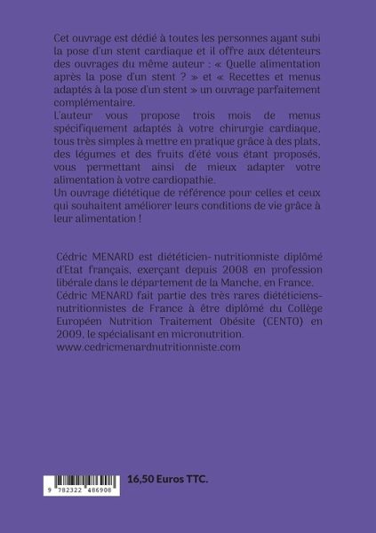 Cet ouvrage est dédié à toutes les personnes ayant subi la pose d'un stent cardiaque et il offre aux détenteurs des ouvrages du même auteur : « Quelle alimentation après la pose d'un stent ? » et « Recettes et menus adaptés à la pose d'un stent » un ouvrage parfaitement complémentaire.L'auteur vous propose trois mois de menus spécifiquement adaptés à votre chirurgie cardiaque, tous très simples à mettre en pratique grâce à des plats, des légumes et des fruits d'été vous étant proposés, vous permettant ainsi de mieux adapter votre alimentation à votre cardiopathie.Un ouvrage diététique de référence pour celles et ceux qui souhaitent améliorer leurs conditions de vie grâce à leur alimentation !