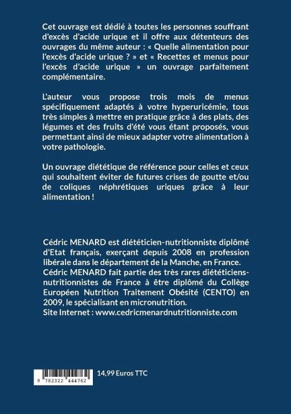 Cet ouvrage est dédié à toutes les personnes souffrant d'excès d'acide urique et il offre aux détenteurs des ouvrages du même auteur : « Quelle alimentation pour l'excès d'acide urique ? » et « Recettes et menus pour l'excès d'acide urique » un ouvrage parfaitement complémentaire.L'auteur vous propose trois mois de menus spécifiquement adaptés à votre hyperuricémie, tous très simples à mettre en pratique grâce à des plats, des légumes et des fruits d'été vous étant proposés, vous permettant ainsi de mieux adapter votre alimentation à votre pathologie.Un ouvrage diététique de référence pour celles et ceux qui souhaitent éviter de futures crises de goutte et/ou de coliques néphrétiques uriques grâce à leur alimentation !