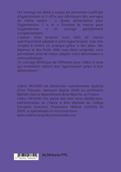 Cet ouvrage est dédié à toutes les personnes souffrant d'hypertension et il offre aux détenteurs des ouvrages du même auteur : « Quelle alimentation pour l'hypertension ? » et « Recettes et menus pour l'hypertension » un ouvrage parfaitement complémentaire.L'auteur vous propose trois mois de menus spécifiquement adaptés à votre hypertension, tous très simples à mettre en pratique grâce à des plats, des légumes et des fruits d'été vous étant proposés, vous permettant ainsi de mieux adapter votre alimentation à votre pathologie.Un ouvrage diététique de référence pour celles et ceux qui souhaitent réduire leur hypertension grâce à leur alimentation !