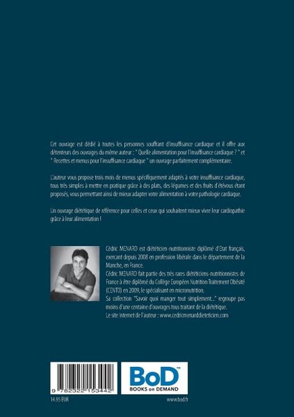 L'auteur vous propose trois mois de menus spécifiquement adaptés à votre insuffisance cardiaque, tous très simples à mettre en pratique grâce à des plats, des légumes et des fruits d'étévous étant proposés, vous permettant ainsi de mieux adapter votre alimentation à votre pathologie cardiaque.