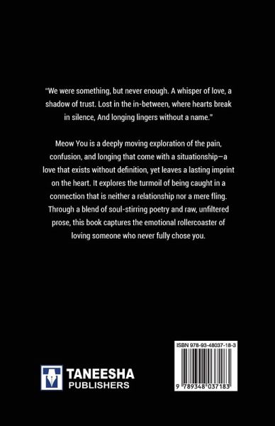 "We were something, but never enough. A whisper of love, a shadow of trust. Lost in the in-between, where hearts break in silence, And longing lingers without a name." Meow You is a deeply moving exploration of the pain, confusion, and longing that come with a situationship-a love that exists without definition, yet leaves a lasting imprint on the heart. It explores the turmoil of being caught in a connection that is neither a relationship nor a mere fling. Through a blend of soul-stirring poetry and raw, unfiltered prose, this book captures the emotional rollercoaster of loving someone who never fully chose you.