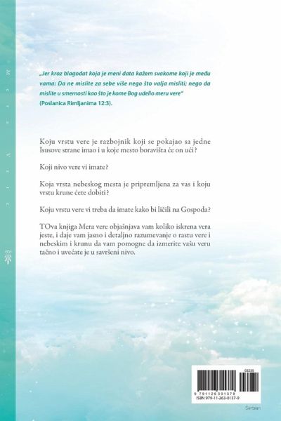 U elji da svako od vas poseduje veru u celokupnoj meri duha i uiva ve¿nu i nebesku slavu u Novom Jerusalimu u kome je tron Boji! Zajedno sa nedavno objavljenom knjigom Poruka sa Krsta, Mera Vere je najbitniji i najvaniji pravac do dobrog Hriš¿anskog ivota. Ja dajem svu zahvalnost i slavu Bogu Ocu koji je blagoslovio da ovaj vaan rad bude objavljen i otkriva duhovno kraljevstvo nebrojenim ljudima. Danas ima mnogo ljudi koji tvrde da veruju ali nisu sigurni u svoje spasenje. Oni ne znaju o meri vere i koliko veliku veru treba da imaju da bi primili spasenje. Ljudi govore jedni o drugima: „Ovaj ¿ovek ima veliku veru," ili „Vera ovog ¿oveka je mala." Ipak, nije lako znati koliko od vaše vere Bog stvarno prihvata ili izmeriti koliko je velika vaša vera ili koliko je porasla. Bog ne eli da imamo telesnu veru ve¿ duhovnu veru präenu delima. Za ljude se kae da imaju telesnu veru ako samo ¿uju ili naüe Re¿ Boju i onda je zapamte i smatraju znanjem. Mi ne moemo da imamo duhovnu veru sopstvenom voljom; to nam je dato samo od Boga. Zbog toga nas Poslanica Rimljanima 12:3 upüuje: „Jer kroz blagodat koja je meni data kaem svakome koji je me¿u vama da ne mislite za sebe više nego što valja misliti; nego da mislite u smernosti kao što je kome Bog udelio meru vere." Ovaj pasus nam govori da svaki pojedinac ima njegovu ili njenu duhovnu Bogom danu veru, i Njegovi odgovori i blagoslovi se razlikuju u odnosu na meru vere svake osobe. 1. Poslanica Jovanova 2:12 i slede¿i stihovi opisuju rast vere svake osobe kao veru nezrelih/nesigurnih beba, dece, mladei i öeva. U 1. Poslanica Korin¿anima 15:41 ¿itamo: „Druga je slava suncu, a druga slava mesecu, i druga slava zvezdama; jer se zvezda od zvezde razlikuje u slavi." Ovaj pasus nas podse¿a da su slava i mesto nebeskog boravka svakog pojedinca razli¿iti, u skladu sa merom njegove ili njene vere. Vano je da se primi spasenje i da se ode u Raj, ali vanije je da znamo na koje mesto boravka u Raju ¿emo oti¿i i kakve krune i nagrade ¿emo primiti. Bog ljubavi eli da Njegova deca rastu do pune mere vere, raduje se njihovom ulasku u Novi Jerusalim u kojemu je Njegov tron i udi da tamo ivi sa njima zauvek. U skladu sa Bojim srcem i üenjem Re¿i, Mera Vere objašnjava pet nivoa vere i nebesko kraljevstvo, i pomae ¿itaocu da odmeri nivo njegove ili njene sopstvene vere. Mera vere i mesta boravka u nebeskom kraljevstvu mogu biti podeljeni na više od pet nivoa, ali ovo delo ih obräuje u pet nivoa kako bi pomoglo ¿itaocima da lakše razumeju. Nadam se da ¿ete napredovati ka Raju još energi¿nije upore¿ivanjem mere vaše vere sa merom predaka vere u Bibliji. Pre mnogo godina, molio sam se da dobijem razjašnjenje nekih stihova iz Biblije koje je bilo teško shvatiti. Onda jednog dana, Bog je pöeo da mi objašnjava da je nebesko kraljevstvo podeljeno i da se nebeska mesta boravka data svakom od Njegove dece razlikuju u skladu sa merom njegove ili njene vere.