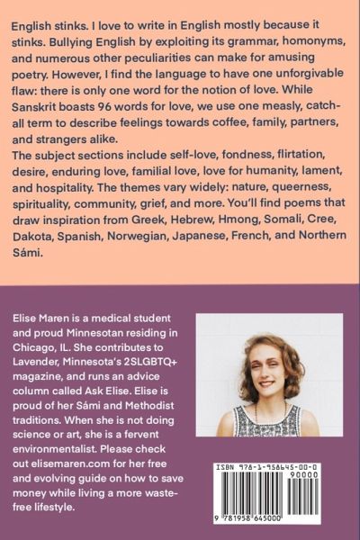 English stinks. I love to write in English mostly because it stinks. Bullying English by exploiting its grammar, homonyms, and numerous other peculiarities can make for amusing poetry. However, I find the language to have one unforgivable flaw: there is only one word for the notion of love. While Sanskrit boasts 96 words for love, we use one measly, catch-all term to describe feelings towards coffee, family, partners, and strangers alike. When I was trying to come up with a way to categorize poems written from age fifteen to the present, the only thing I could come up with was to organize themes in terms of what type of love they convey. The Greek language facilitated this, and a book with Greek chapters needs a Greek title. From there, Meraki: Love Letters to Language was born. The title came quite naturally, as I have poured much of myself into this work. The subject sections include self-love, fondness, flirtation, desire, enduring love, familial love, love for humanity, lament, and hospitality. The themes vary widely: nature, queerness, spirituality, community, grief, and more. As you'll see throughout Meraki, I find language generally fascinating. However, don't mistake me for a polyglot. It's all Greek to me - pun intended. You'll find poems that draw inspiration from Greek, Hebrew, Hmong, Somali, Spanish, Norwegian, Japanese, French, and Northern Sámi. Many thanks to the native speakers who helped me verify translations and concepts. Some poems are fully in another language and then translated into English on the next page. One poem in this book is only in English but is nearly unrecognizable; it uses obsolete vocabulary to tell a story about someone who reads the dictionary as she falls hopelessly in love with a librarian. Don't worry, I provided a glossary on the next page. At the end of the book, you'll find an appendix providing further information and context about each poem if you'd like to learn more or did not catch a reference. I'm always curious what writers were thinking while they wrote, so I provided a bit of the behind the scenes for you. I aim to write the kinds of books I'd want to read. Meraki is simultaneously a love letter to language and hate mail addressed specifically to English's rusty, old mailbox. I hope you enjoy reading Meraki just as much as I enjoyed creating it.