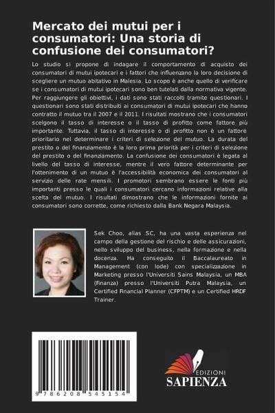 Lo studio si propone di indagare il comportamento di acquisto dei consumatori di mutui ipotecari e i fattori che influenzano la loro decisione di scegliere un mutuo abitativo in Malesia. Lo scopo è anche quello di verificare se i consumatori di mutui ipotecari sono ben tutelati dalla normativa vigente. Per raggiungere gli obiettivi, i dati sono stati raccolti tramite questionari. I questionari sono stati distribuiti ai consumatori di mutui ipotecari che hanno contratto il mutuo tra il 2007 e il 2011. I risultati mostrano che i consumatori scelgono il tasso di interesse o il tasso di profitto come fattore più importante. Tuttavia, il tasso di interesse o di profitto non è un fattore prioritario nel determinare i criteri di selezione del mutuo. La durata del prestito o del finanziamento è la loro prima priorità per i criteri di selezione del prestito o del finanziamento. La confusione dei consumatori è legata al livello del tasso di interesse, mentre il vero fattore determinante per l'ottenimento di un mutuo è l'accessibilità economica dei consumatori al servizio delle rate mensili. I promotori sembrano essere le fonti più importanti presso le quali i consumatori cercano informazioni relative alla scelta del mutuo. I risultati dimostrano che le informazioni fornite ai consumatori sono corrette, come richiesto dalla Bank Negara Malaysia.