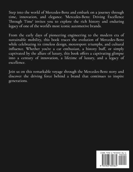 Step into the world of Mercedes-Benz and embark on a journey through time, innovation, and elegance. 'Mercedes-Benz: Driving Excellence Through Time' invites you to explore the rich history and enduring legacy of one of the world's most iconic automotive brands. From the early days of pioneering engineering to the modern era of sustainable mobility, this book traces the evolution of Mercedes-Benz while celebrating its timeless design, motorsport triumphs, and cultural influence. Whether you're a car enthusiast, a history buff, or simply captivated by the allure of luxury, this book offers a captivating glimpse into a century of innovation, a lifetime of luxury, and a legacy of excellence. Join us on this remarkable voyage through the Mercedes-Benz story and discover the driving force behind a brand that continues to inspire generations.