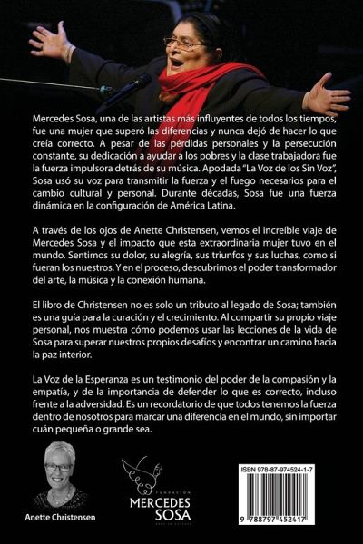 Mercedes Sosa, una de las artistas más influyentes de todos los tiempos, fue una mujer que superó las diferencias y nunca dejó de hacer lo que creía correcto. A pesar de las pérdidas personales y la persecución constante, su dedicación a ayudar a los pobres y la clase trabajadora fue la fuerza impulsora detrás de su música. Apodada "La Voz de los Sin Voz", Sosa usó su voz para transmitir la fuerza y ¿¿el fuego necesarios para el cambio cultural y personal. Durante décadas, Sosa fue una fuerza dinámica en la configuración de América Latina. ¿¿¿Mercedes Sosa - La Voz de la Esperanza traza la extraordinaria vida y carrera de Sosa y ofrece un perfil psicológico que muestra el carácter y las acciones de la artista y revela cómo la educación de Sosa, el entorno político y sus aflicciones personales la moldearon. A través de los ojos de Anette Christensen, vemos el increíble viaje de Mercedes Sosa y el impacto que esta extraordinaria mujer tuvo en el mundo. Sentimos su dolor, su alegría, sus triunfos y sus luchas, como si fueran los nuestros. Y en el proceso, descubrimos el poder transformador del arte, la música y la conexión humana. El libro de Christensen no es solo un tributo al legado de Sosa; también es una guía para la curación y el crecimiento. Al compartir su propio viaje personal, nos muestra cómo podemos usar las lecciones de la vida de Sosa para superar nuestros propios desafíos y encontrar un camino hacia la paz interior. La Voz de la Esperanza es un testimonio del poder de la compasión y la empatía, y de la importancia de defender lo que es correcto, incluso frente a la adversidad. Es un recordatorio de que todos tenemos la fuerza dentro de nosotros para marcar una diferencia en el mundo, sin importar cuán pequeña o grande sea. Te dejará sintiéndote empoderado, animado y listo para enfrentar cualquier desafío que se te presente.(Segundas ediciones) ÍNDICE -Coqui Sosa, sobrino de Mercedes Sosa, Cantante, Autor y Embajador Cultural en el estado de Tucumán, Argentina. ADHESIONES -Fabián Matus, hijo de Mercedes Sosa y presidente de la Fundación Mercedes Sosa hasta su muerte el 15 de marzo de 2019 -Pauline Skeates, terapeuta, directora de Insight-International y creadora de la Terapia Enfocada en la Percepción, Nueva Zelanda. TRIBUTO -Konstantin Wecker, cantante y poeta alemán. ¿¿¿¿La autora danesa, Anette Christensen, pinta un retrato que incorpora los colores de la desesperación, el triunfo, el amor, el miedo y todas las demás emociones humanas que definen una vida. - Charles Musser, historiador de cine, documentalista y profesor de estudios de cine y medios "Estoy impresionado a nivel personal, como lector, y como crítico. La primera parte me parece muy auténtica, informativa y conmovedora, pero la parte dos me ha dejado sin aliento. ¡Mucho de lo escrito resonó en mí, de tal manera que no pude dejar el libro hasta terminarlo!" Barbara Webb, Autora y Crítica Literaria CONTACTO mercedes-sosa.com facebook.com/AnetteChristensenAuthor