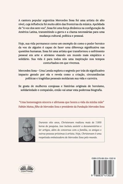 Mercedes Sosa - Uma Lenda, traça a jornada espiritual, política e artística de Sosa, e explora o segredo por trás do significativo impacto gerado por ela. A narrativa traz um perfil psicológico que revela como a criação, circunstâncias políticas e tragédias pessoais moldaram a vida e a carreira de Sosa. A cantora popular argentina Mercedes Sosa foi uma artista de alto nível, cuja influência foi muito além das fronteiras da música. Apelidada de "A voz dos sem voz", Sosa foi uma força dinâmica na configuração da América Latina, transmitindo a garra e a chama necessárias para uma mudança cultural, pessoal e política. Hoje, sua vida permanece como um exemplo de como o poder heróico da voz de alguém é capaz de fazer uma diferença significativa nas questões humanas. Sosa foi uma artista que transformou o sofrimento pessoal em arte e ativismo visando um mundo mais empático e solidário. Sua vida é para todos nós uma inspiração nos tempos conturbados em que vivemos. Mercedes Sosa - Uma Lenda explora o segredo por trás do significativo impacto gerado por ela e revela como a criação, circunstâncias políticas e tragédias pessoais moldaram sua vida e carreira. Se gosta de mulheres corajosas e histórias originais de heroísmo, solidariedade e compaixão, então vai amar esta poderosa biografia. "Uma homenagem sincera e afetuosa que honra a vida da minha mãe" - Fabián Matus, filho de Mercedes Sosa e presidente da Fundação Mercedes Sosa