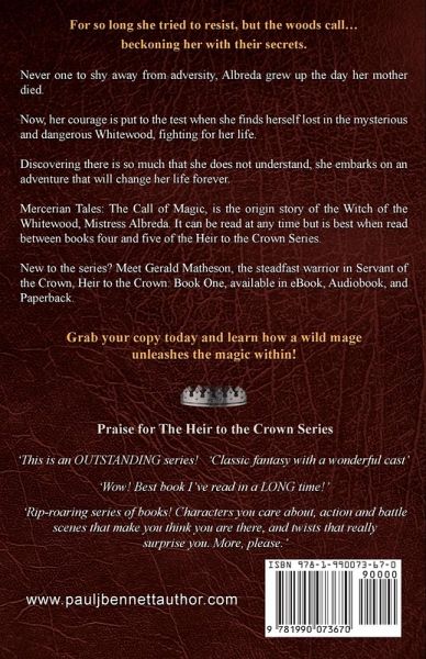 For so long she tried to resist, but the woods call... beckoning her with their secrets. Never one to shy away from adversity, Albreda grew up the day her mother died. Now, her courage is put to the test when she finds herself lost in the mysterious and dangerous Whitewood, fighting for her life. Discovering there is so much that she does not understand, she embarks on an adventure that will change her life forever. Mercerian Tales: The Call of Magic, is the origin story of the Witch of the Whitewood, Mistress Albreda. It can be read at any time but is best when read between books four and five of the Heir to the Crown Series. ¿Grab your copy today and learn how a wild mage unleashes the magic within! New to the series? Meet Gerald Matheson, the steadfast warrior in Servant of the Crown, Heir to the Crown: Book One, available in eBook, Audiobook, and Paperback.
