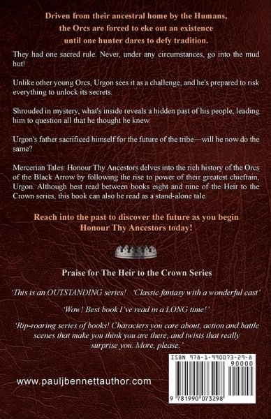 Driven from their ancestral home by the Humans, the Orcs are forced to eke out an existence until one hunter dares to defy tradition. They had one sacred rule. Never, under any circumstances, go into the mud hut! Unlike other young Orcs, Urgon sees it as a challenge, and he's prepared to risk everything to unlock its secrets. Shrouded in mystery, what's inside reveals a hidden past of his people, leading him to question all that he thought he knew. Urgon's father sacrificed himself for the future of the tribe-will he now do the same? Mercerian Tales: Honour Thy Ancestors delves into the rich history of the Orcs of the Black Arrow by following the rise to power of their greatest chieftain, Urgon. Although best read between books eight and nine of the Heir to the Crown series, this book can also be read as a stand-alone tale. Reach into the past to discover the future as you begin Honour Thy Ancestors today! New to the series? Meet Gerald Matheson, the steadfast warrior in Servant of the Crown, Heir to the Crown: Book One, available in eBook, Audiobook, and Paperback.