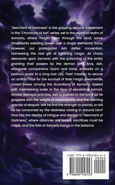 "Merchant of Darkness" is the gripping second installment in the "Chronicles of Ash" series, set in the mystical realm of Asmaria, where magic flows through the land, each inhabitant wielding power over a single elemental force. However, our protagonist Ash defies convention, harnessing the rare gift of lightning magic. As chaos descends upon Asmaria with the poisoning of the entity granting their powers by the demon king Aros, Ash, alongside companions Quinn and Kane, embarks on a perilous quest to a long-lost city. Their mission: to secure an artifact vital for the survival of their magic. Meanwhile, unrest brews among the Guardians of Asmaria, tasked with maintaining order in the face of escalating turmoil. Amidst betrayal and loss, Ash is pushed to the brink as he grapples with the weight of responsibility and the looming specter of despair. Will he find the strength to prevail, or will he be consumed by the darkness closing in around him? Dive into the depths of intrigue and danger in "Merchant of Darkness," where alliances are tested, sacrifices must be made, and the fate of Asmaria hangs in the balance.