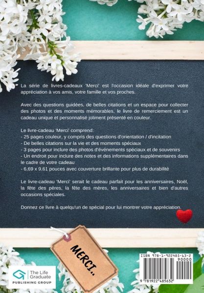 La série de livres-cadeaux 'Merci' est l'occasion idéale d'exprimer votre appréciation à vos amis, votre famille et vos proches. Avec des questions guidées, de belles citations et un espace pour collecter des photos et des moments mémorables, le livre de remerciement est un cadeau unique et personnalisé joliment présenté en couleur. Le livre-cadeau 'Merci' comprend: - 25 pages couleur, y compris des questions d'orientation / d'incitation - De belles citations sur la vie et des moments spéciaux - 3 pages pour inclure des photos d'événements spéciaux et de souvenirs - Un endroit pour inclure des notes et des informations supplémentaires dans le cadre de votre cadeau - 6,69 x 9,61 pouces avec couverture brillante pour plus de durabilité Le livre-cadeau 'Merci' serait le cadeau parfait pour les anniversaires, Noël, la fête des pères, la fête des mères, les anniversaires et bien d'autres occasions spéciales. Donnez ce livre à quelqu'un de spécial pour lui montrer votre appréciation.