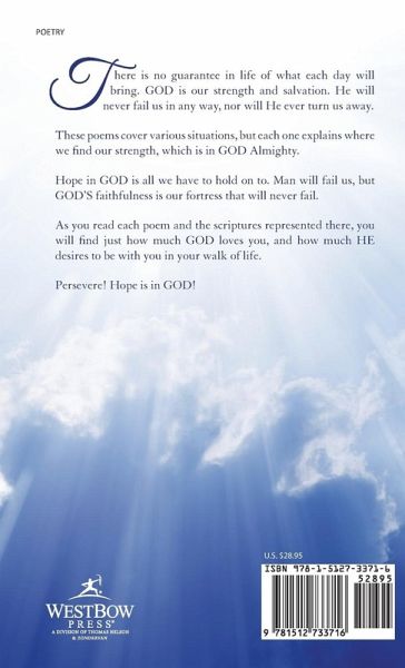 There is no guarantee in life of what each day will bring. GOD is our strength and salvation. He will never fail us in any way, nor will He ever turn us away. These poems cover various situations, but each one explains where we find our strength, which is in GOD Almighty. Hope in GOD is all we have to hold on to. Man will fail us, but GOD'S faithfulness is our fortress that will never fail. As you read each poem and the scriptures represented there, you will find just how much GOD loves you, and how much HE desires to be with you in your walk of life. Persevere! Hope is in GOD!