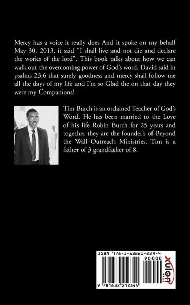 Mercy has a voice it really does And it spoke on my behalf May 30, 2013, it said "I shall live and not die and declare the works of the lord". This book talks about how we can walk out the overcoming power of God's word, David said in psalms 23:6 that surely goodness and mercy shall follow me all the days of my life and I'm so Glad the on that day they were my Companions! Tim Burch is an ordained Teacher of God's Word. He has been married to the Love of his life Robin Burch for 25 years and together they are the founder's of Beyond the Wall Outreach Ministries. Tim is a father of 3 grandfather of 8.