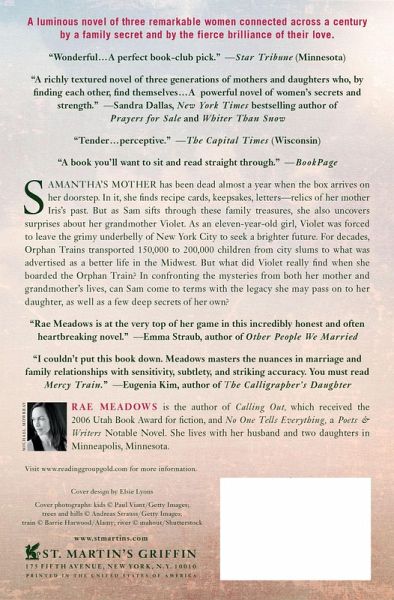 A rich, luminous novel of three remarkable women connected across a century by a family secret and by the fierce brilliance of their love Samantha's mother has been dead almost a year when the box arrives on her doorstep. In it, she finds recipe cards, keepsakes, letters-relics of her mother Iris's past. But as Sam sifts through these family treasures, she uncovers evidence that her grandmother, Violet, had a much more difficult childhood then she could have ever imagined. And Sam, a struggling new mother herself, begins to see her own burdens in a completely different light. Moving from the tempered calm of contemporary Madison, Wisconsin to the seedy underbelly of early twentieth century New York, we come face to face with a haunting piece of America's past: From 1854 to 1929 orphan trains from New York transported 150,000 to 200,000 destitute, orphaned or abandoned children across the country to find homes on farms in the Midwest. Rae Meadows takes us on our own journey of discovery in Mercy Train (originally published as Mothers & Daughters), an affecting and wonderfully woven novel about three generations of motherhood, family, and the surprising sacrifices we make for the people we love.