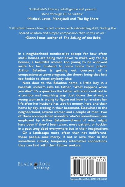 In a neighborhood nondescript except for how often small houses are being torn down to make way for big houses, a beautiful woman too young to be widowed waits for her husband to come home from prison. Arthur Baladino is getting out courtesy of a compassionate leave program, the theory being that he's too feeble to shoot anybody else. Next door to the Baladino home, a little boy in a baseball uniform asks his father, "What happens when you die?" It's a question the father will soon confront in a terrible and surprising way. Just down the street, a young woman is trying to figure out how to re-start her life after her husband has lost his money, hers, and their home by day-trading in their basement. Elsewhere in the neighborhood, several women and a couple of men-two of them accomplished arsonists who've sometimes been employed by Arthur Baladino-dream of what might have been if they'd been wiser, more patient, or luckier in a past long dead everywhere but in their imaginations. On a landscape more often than not indifferent, these people seek mercy, if not in love, than in the sometimes rickety, temporary alternative connections they can find with their fellow seekers.